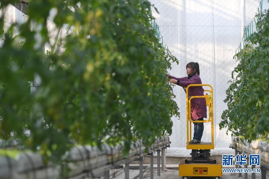 3月9日,在河北省曲周县一家创意农业园区,工人在管理立体无土栽培的西红柿。