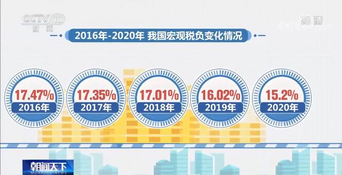 数据显示,2016—2020年,我国宏观税负逐年降低。其中,2019年和2020年,随着我国大规模减税降费措施的实施落地,宏观税负基本保持了年降约一个百分点的水平,2020年已经降至15.2%,比“十二五”末2015年的18.13%降低近3个百分点。
