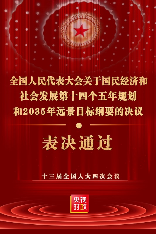 十三届全国人大四次会议表决通过了关于国民经济和社会发展第十四个五年规划和2035年远景目标纲要的决议。