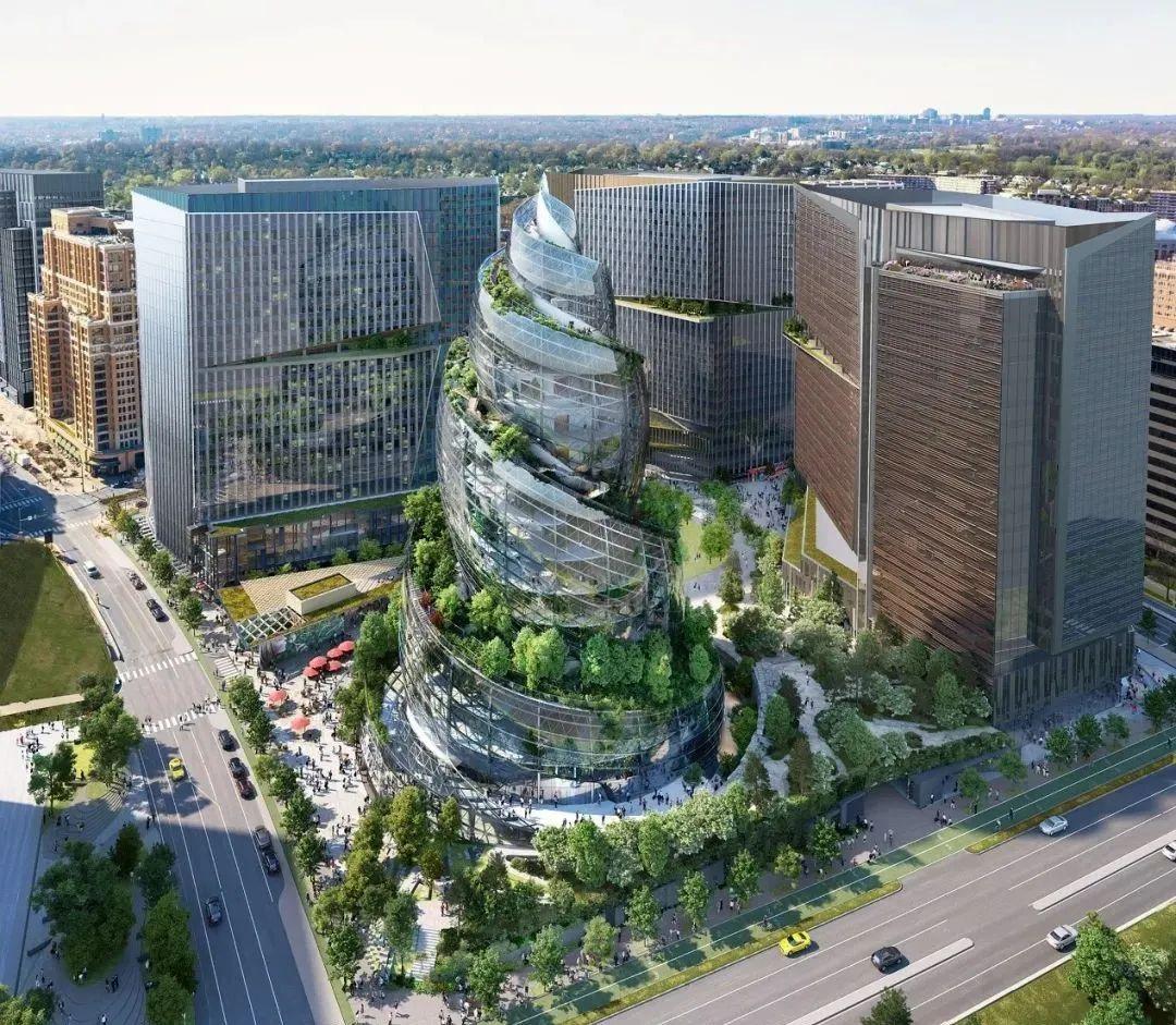 Helix由美国著名建筑事务所NBBJ领衔设计,由位于阿灵顿五角大楼附近的一组空置仓库改造而成。高350英尺,共22层,占地约3.4万平方米,合计容纳13000名员工,未来的十年,亚马逊将在这片土地上拥有850000平方英尺的办公空间。