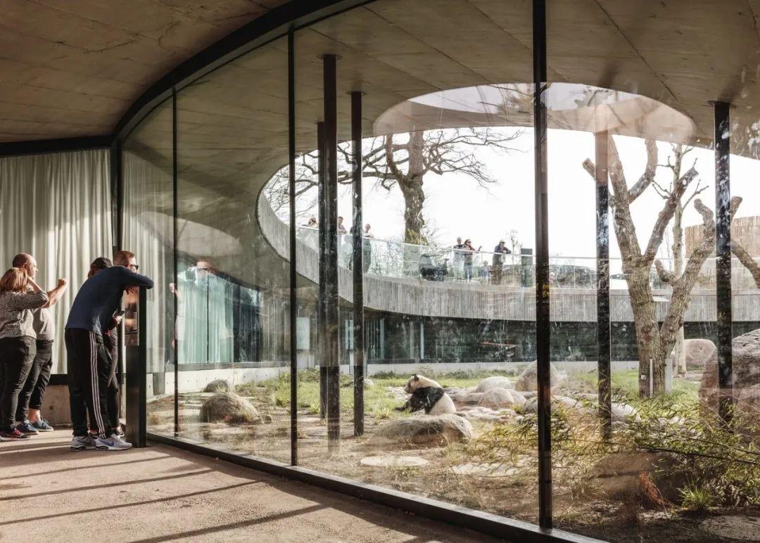 参观路径沿着环形的围墙逐渐下降,游客们可以在室外的环形斜坡上观看大熊猫。