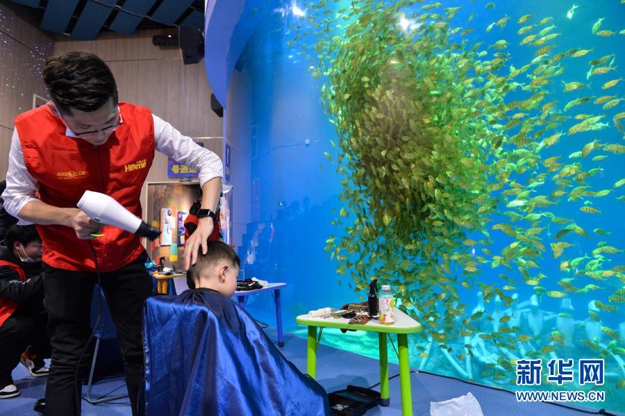 3月14日在合肥海洋世界拍摄的游客免费理发现场。