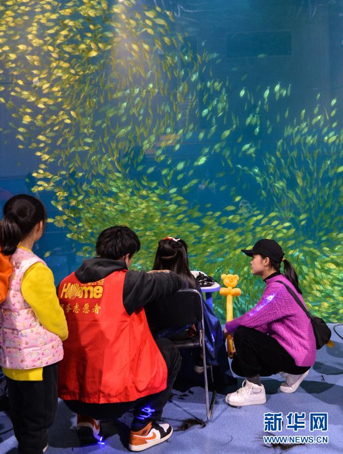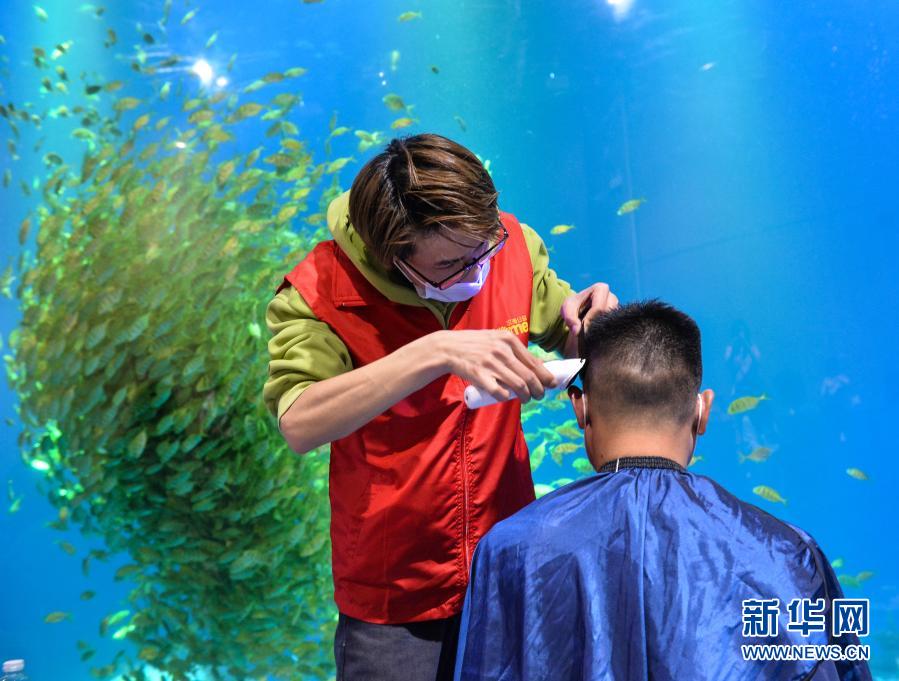 3月14日,志愿者在合肥海洋世界为游客理发。