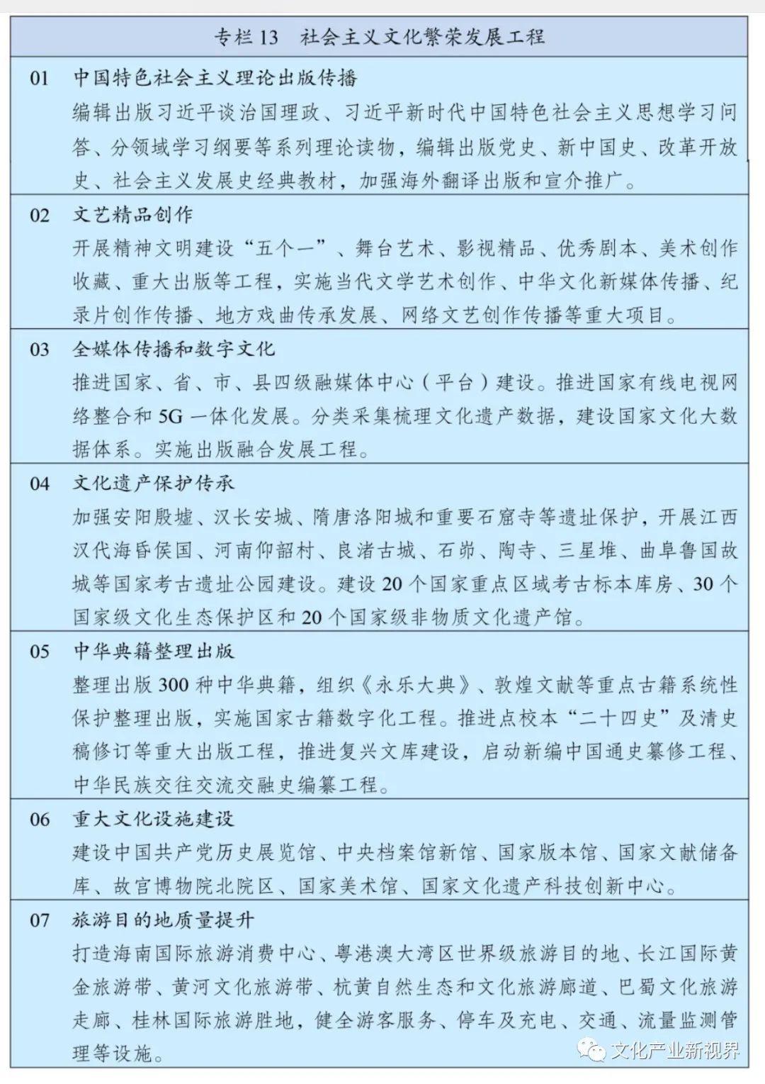 实施文化产业数字化战略,加快发展新型文化企业、文化业态、文化消费模式,壮大数字创意、网络视听、数字出版、数字娱乐、线上演播等产业。加快提升超高清电视节目制播能力,推进电视频道高清化改造,推进沉浸式视频、云转播等应用。实施文化品牌战略,打造一批有影响力、代表性的文化品牌。培育骨干文化企业,规范发展文化产业园区,推动区域文化产业带建设。积极发展对外文化贸易,开拓海外文化市场,鼓励优秀传统文化产品和影视剧、游戏等数字文化产品“走出去”,加强国家文化出口基地建设。