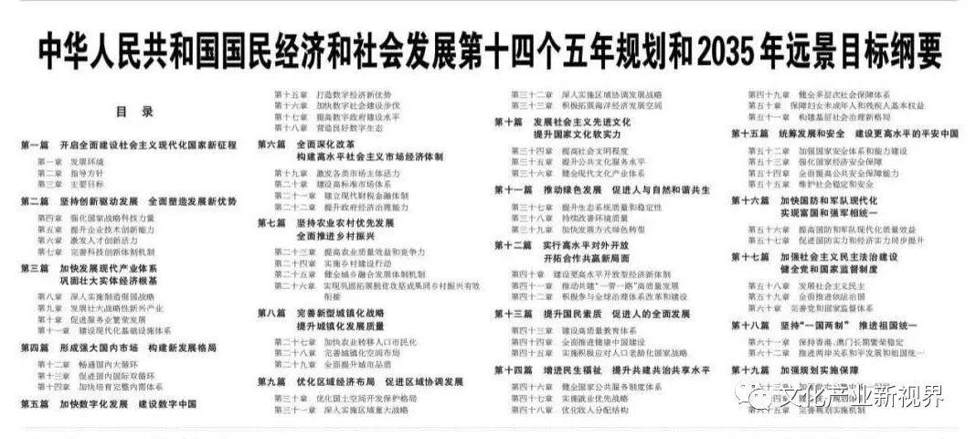 《中华人民共和国国民经济和社会发展第十四个五年规划和2035年远景目标纲要》日前正式发布,64000多字的内容,分量足、含金量高,指引未来五年的发展、勾勒未来15年的目标,主流媒体都以十个整版的篇幅刊发了纲要全文。纲举目张,全文19篇65章统筹推进经济建设、政治建设、文化建设、社会建设、生态文明建设的总体布局,各行各业都有了发展的目标和方向。文化的内容在第十篇“发展社会主义先进文化 提升国家文化软实力”中重磅呈现,从提高社会文明程度、提升公共文化服务水平、健全现代文化产业体系三章内容展开。