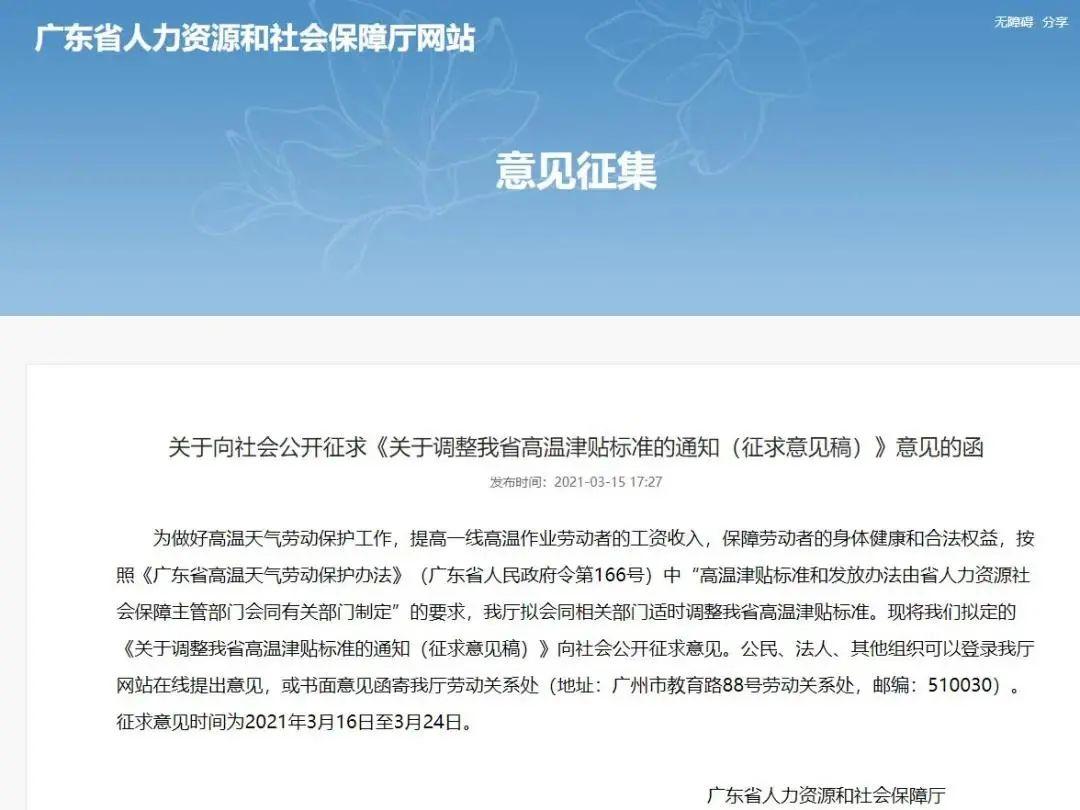 日前,广东省人社厅在官方网站发布《关于调整我省高温津贴标准的通知(征求意见稿)》,面向社会公开征求意见,拟调高广东省高温津贴标准至每人每月300元;如按照规定需按天数折算高温津贴的,每人每天13.8元。征求意见时间截止至3月24日。