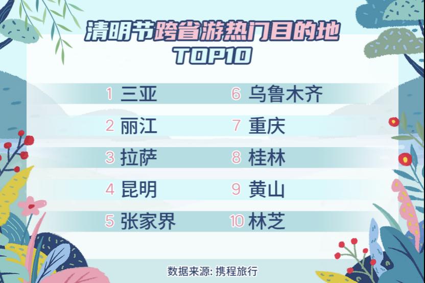 清明节将迎来今年跨省游的首次高峰。数据显示,清明节跨省游热门目的地有:三亚、丽江、拉萨、昆明、张家界、乌鲁木齐、重庆、桂林、黄山和林芝。