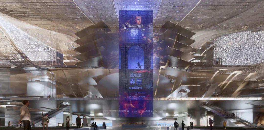 在轻盈、漂浮、通透的曲面屋顶之下,歌剧厅、音乐厅等核心展演空间临海布局,形成可直接到达海岸的公共路径与视觉通廊。开放的艺术街区满足了公共音乐体验、公众展演集会等文化活动需求。歌剧院主轴线结合光影效果,塑造出极具未来感的丰富公共空间体验。