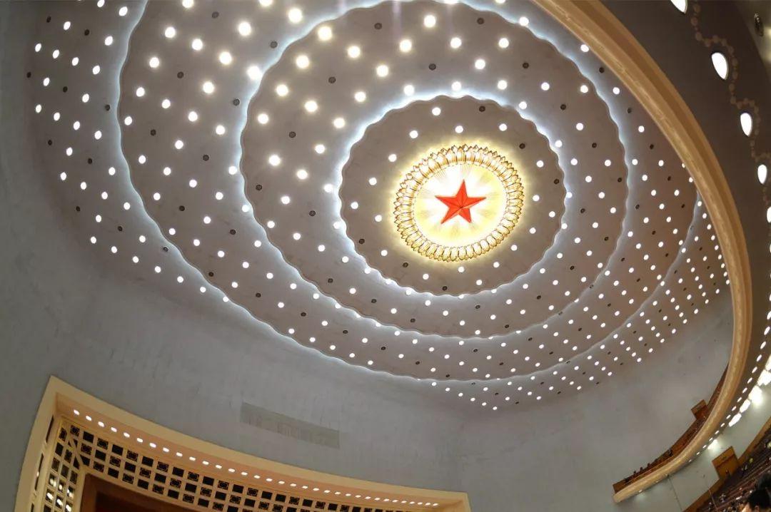 在大会堂施工过程中,有人提出,万人大礼堂层高过高,显得人很渺小,但观众席的两层挑台又使人感到压抑。这个看似矛盾的技术难题被周总理用一句王勃的名句点破:“落霞与孤鹜齐飞,秋水共长天一色。”在周总理的启发下,设计师把顶棚做成象征天体空间的大穹隆形,与墙身交接处则由直线改为圆角,形成了浑然一体的效果。穹顶上,三层水波形的暗灯槽围绕着红五角星,500个灯孔点缀其间,观众一抬头就可见繁星点点,丝毫不会感到生硬和压抑。