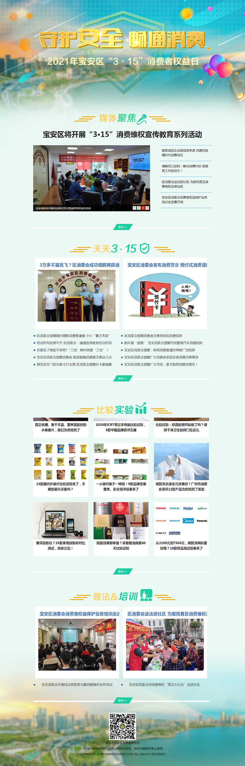此外,深圳宝安网清空将推出《宝安区“3·15”消费者权益日系列活动》网络专题,聚焦消费维权工作动态、普法活动、消费维权知识、比较实验等内容,集中展现今年的宣传活动情况及宝安区消委会近期开展的各项亮点工作。