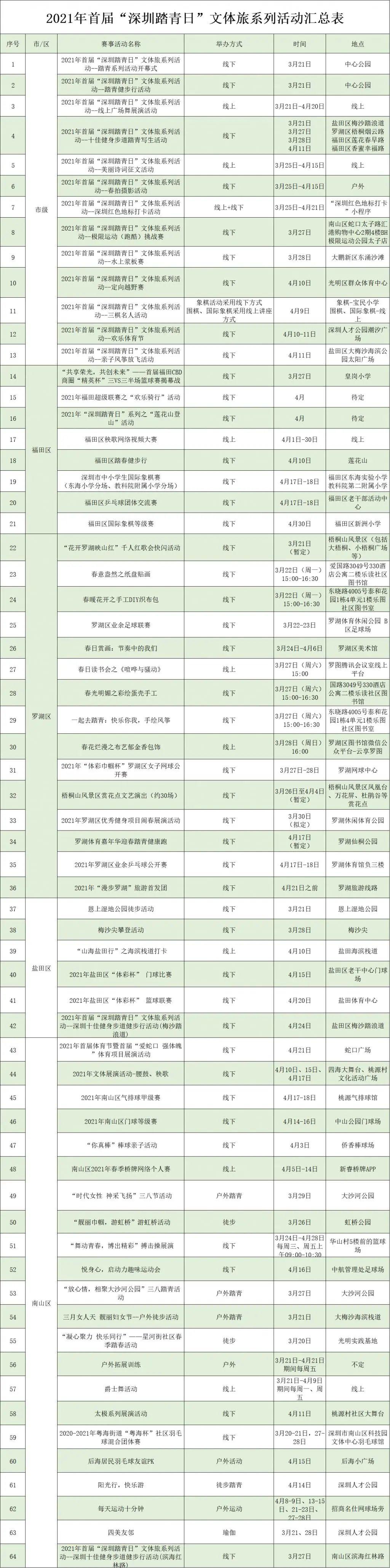 3月21日上午,2021首届“深圳踏青日”文体旅系列活动启动仪式在中心公园举办。接下来1个月,将举办健身徒步、欢乐体育节、踏青写生、诗词征集、春拍摄影展等超过100项丰富多彩的特色体育文化旅游活动。市民可以参与到各项文体旅活动,用脚步丈量深圳美景,用心灵感受城市活力。