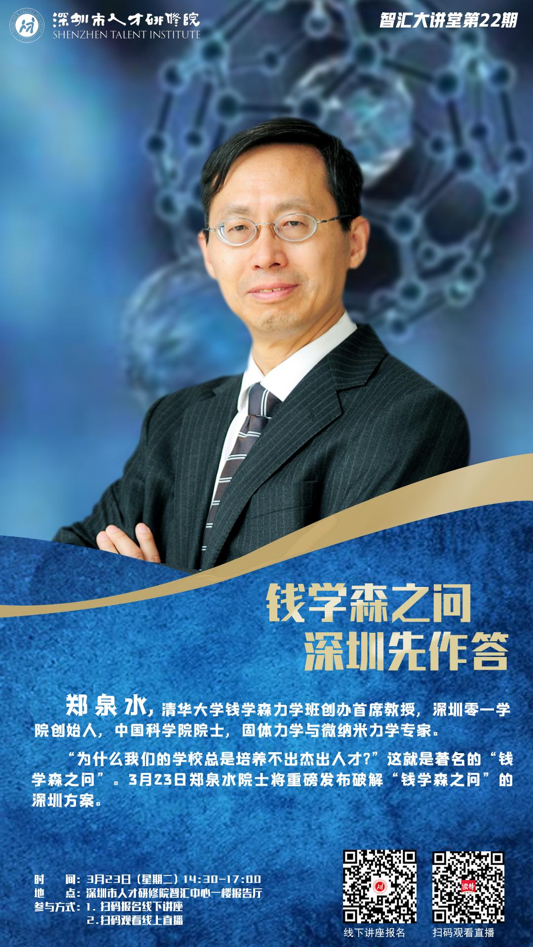 为进一步向社会传递学院创办理念,激励广大高层次人才、高校师生、青年人才敢于创新、善于创新,为我市构建高质量发展高地贡献智慧和力量,深圳市人才研修院将于3月23日(星期二)邀请清华大学教授、零一学院创始人、中国科学院院士、固体力与微纳米力学专家郑泉水围绕“钱学森之问”开展专题讲座,重磅发布“深圳方案”!