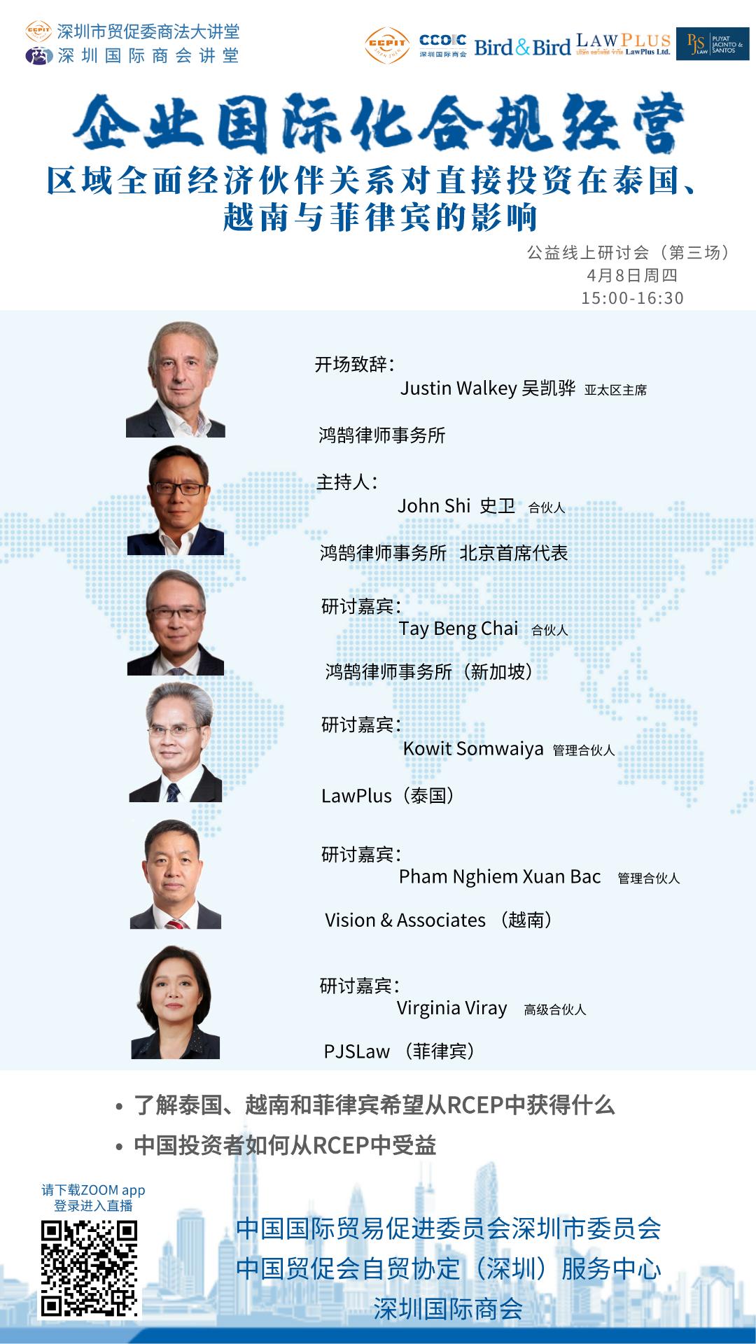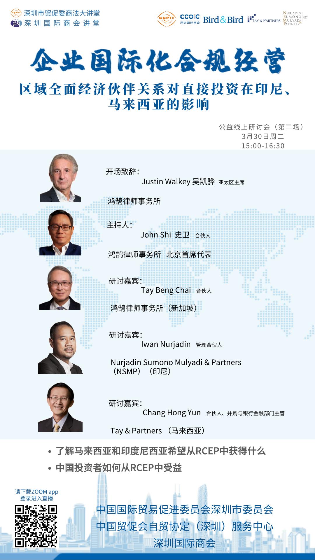 本次线上活动将邀请鸿鹄律师事务所(Bird & Bird)北京首席代表John Shi、合伙人律师(新加坡)Tay Beng Chai、Marcus Chow和锦天城律师事务所高级合伙人刘炯等10位来自新加坡、马来西亚、泰国、越南、印尼等地的法律专家作为主讲嘉宾进行线上授课和答疑。