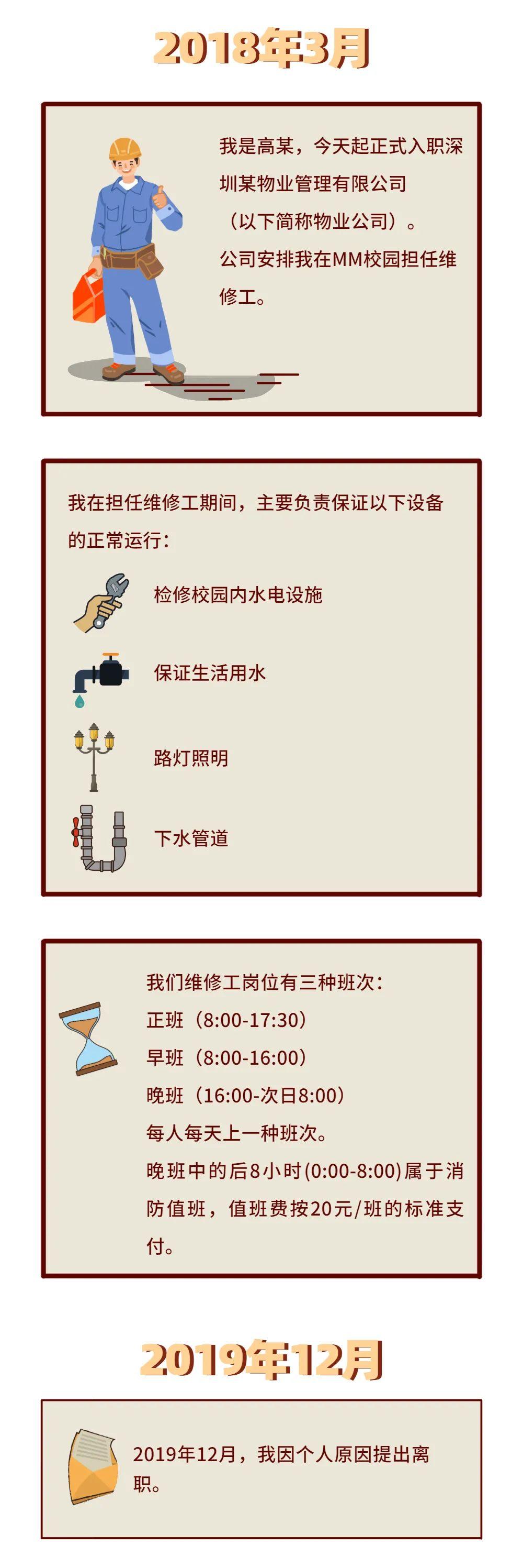 第二,高某的工作内容是负责维护大学校园内的水电设施,保证生活用水、路灯照明、下水管等正常运行。双方均确认,无论何种班次(包括消防值班时间),需保证正常运行的设备相同。