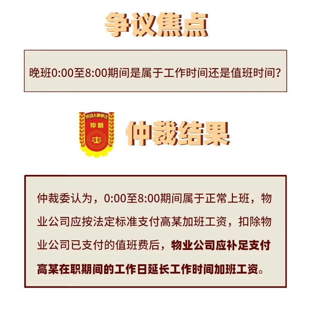 因此仲裁委认定高某在晚班0:00至8:00期间提供劳动属于工作时间的延续,物业公司应按法定加班工资标准支付高某工作日延长工作时间加班工资。