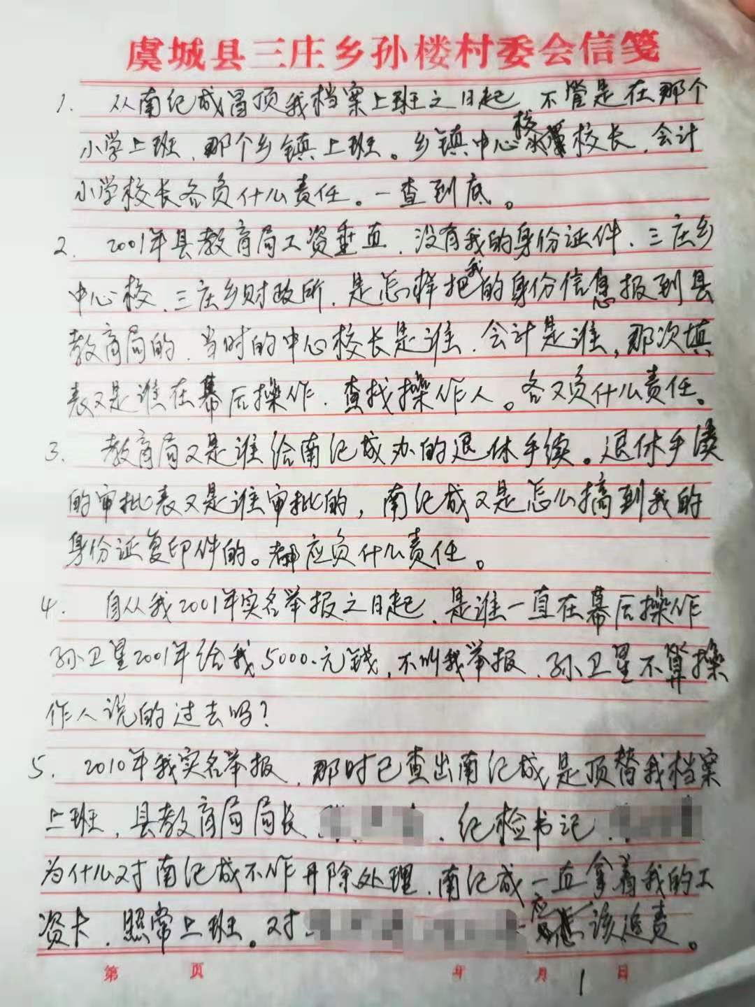 2月24日,虞城县教体局发布通报称:2018年5月,南纪成因顶替民师指标被县教体局取消其以孙存良名字享受的退休待遇;参与当年办理手续的相关人员,已于2018年5月由县纪委、县教体局分别给予严肃处理。