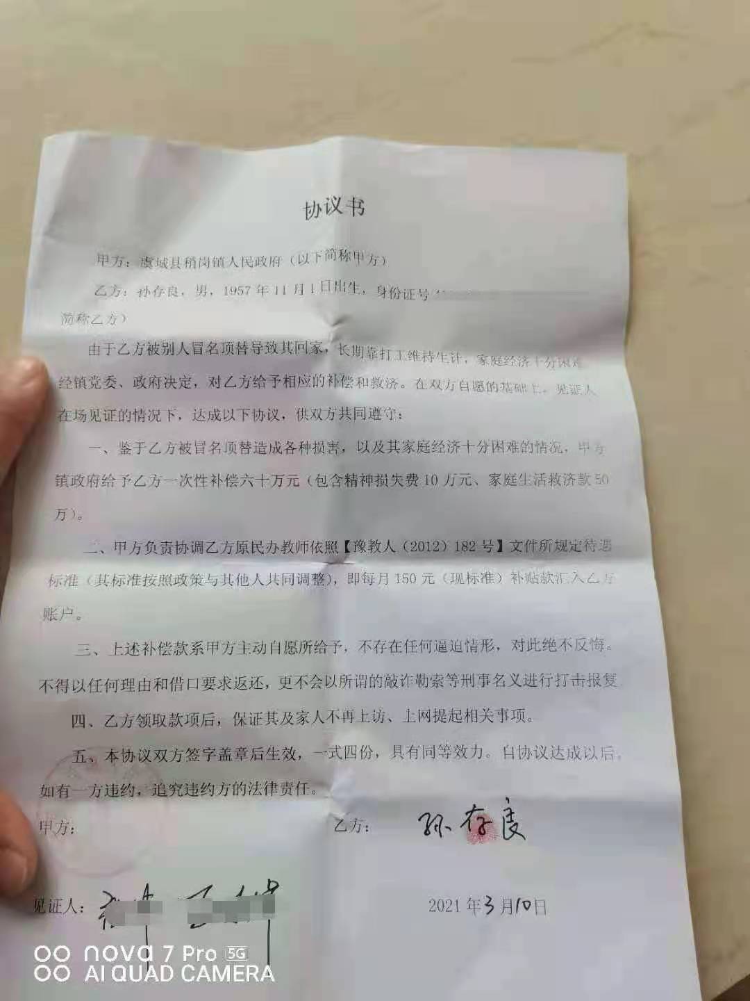 3月5日,“由于被别人冒名顶替导致其回家,长期靠打工维持生计,家庭经济十分困难”,镇政府决定一次性给予孙存良60万的“补偿和救济”,包含精神损失费10万元、家庭生活救济款50万元。