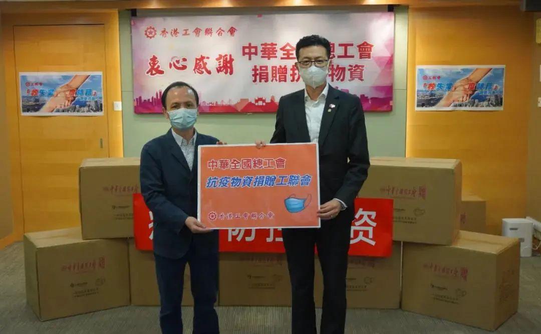 ▲中华全国总工会向香港工会联合会(以下简称“香港工联会”)和港九劳工社团联会捐贈40万抗疫物资口罩。