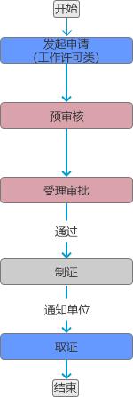 (3.2) 工作许可单一业务:线上选择无需预约类工作许可业务提交申请-材料预审核-受理审核-证件制作-通知取证。流程如下: