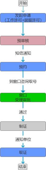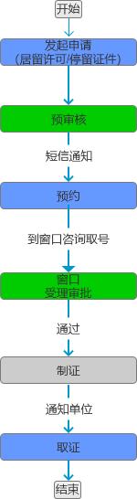 (2) 居/停留单一业务:线上选择居留/停留业务提交申请-材料预审核-预约-窗口交材料-审核-证件制作-通知取证。流程如下: