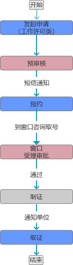 (3.1) 工作许可单一业务:线上选择需预约类工作许可业务提交申请-材料预审核-预约-窗口交材料-审核-证件制作-通知取证。流程如下:
