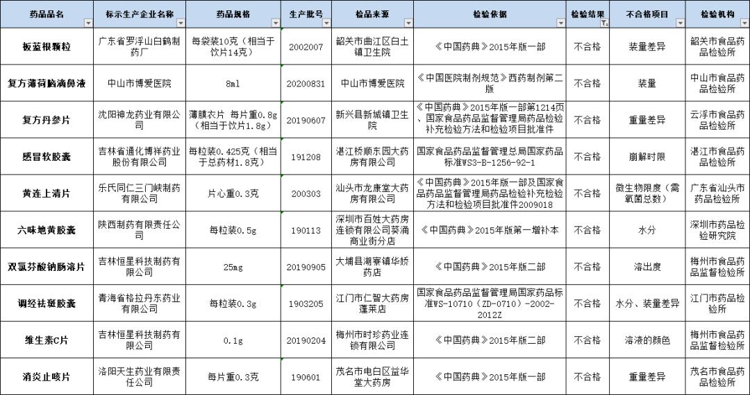 标示为广东省罗浮山白鹤制药厂生产的板蓝根颗粒(生产批号2002007)不合格,不合格项目为装量差异。
