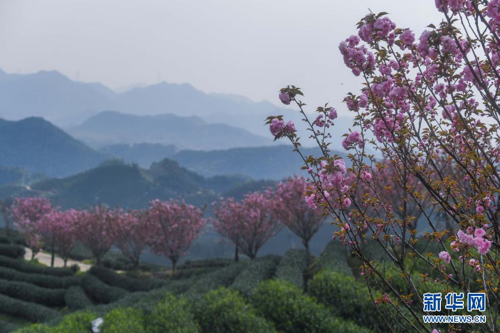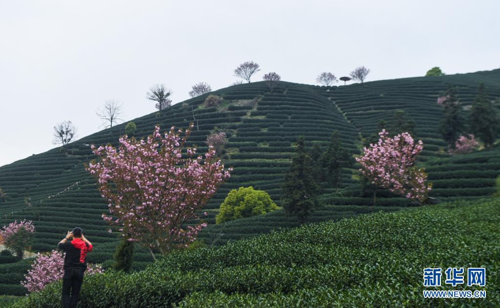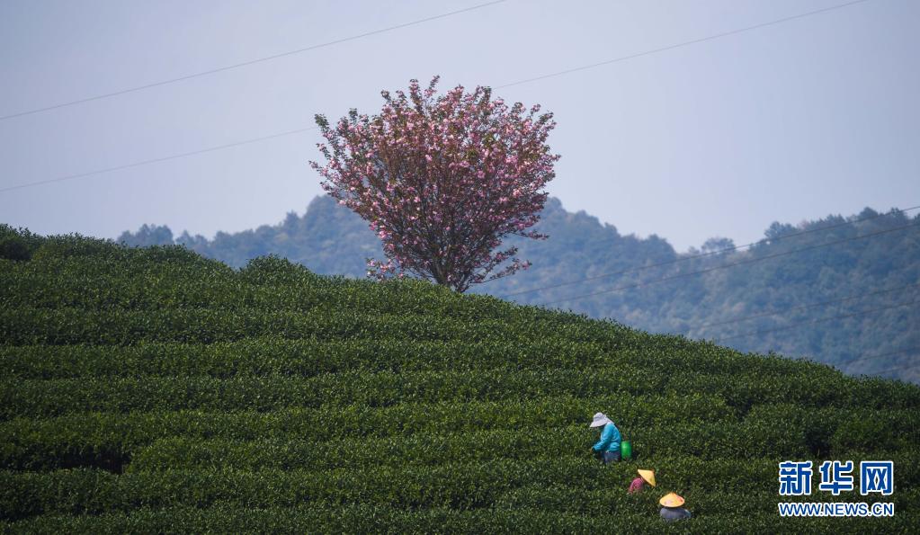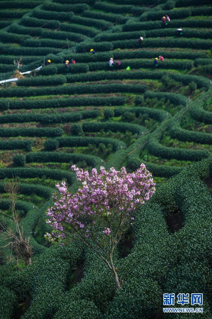 近期,浙江省杭州市富阳区富春街道拔山村的万亩茶园春茶采摘正当时,而茶园中的千株晚樱陆续进入了盛花期,点缀在绿色茶园中,呈现出一幅美丽山乡春色画卷。