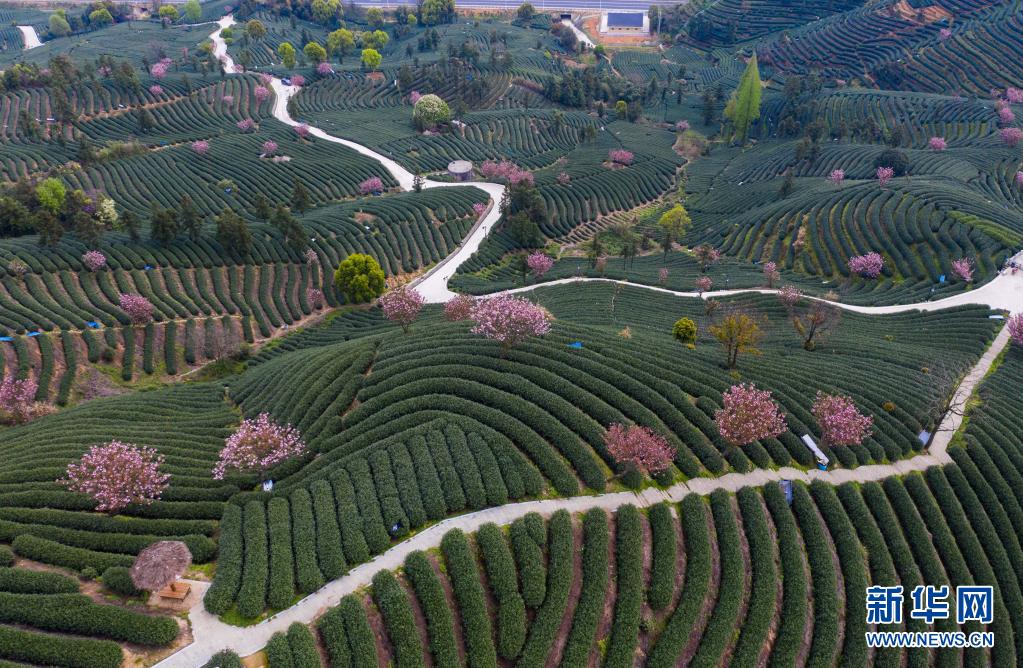 拔山村万亩茶园内盛开的樱花与绿色的茶树构成了美丽的春色画卷(3月29日摄,无人机照片)。新华社记者徐昱摄