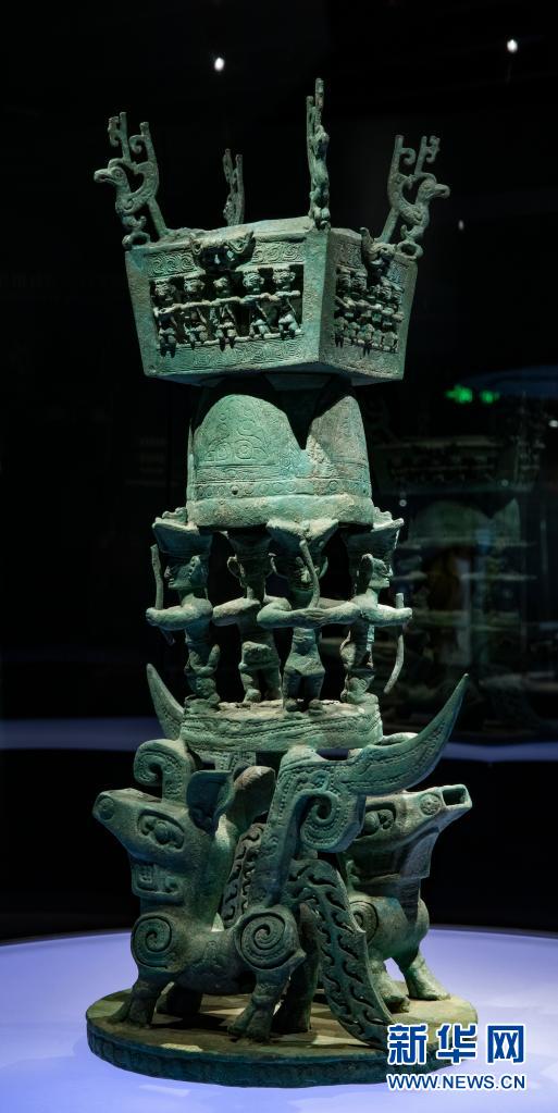 这是在位于四川省广汉市的三星堆博物馆拍摄的1986年出土于三星堆2号“祭祀坑”的青铜神坛(研究性复原件,3月5日摄)。该器可分为三层:底层是一对头尾相向的神兽;中层为四立人及头顶的山峰;上层有建筑及人物、飞鸟造型等,建筑额间有人首鸟身神像。其竖向垂直展开的时空序列表征天、地、人“三界”,生动形象地展现了古蜀人的神话宇宙观。新华社记者沈伯韩摄