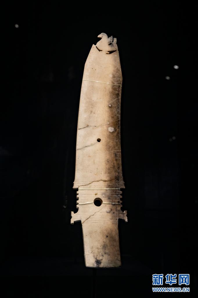 这是在位于四川省广汉市的三星堆博物馆拍摄的1986年出土于三星堆1号“祭祀坑”的玉璋(3月17日摄)。新华社记者沈伯韩摄