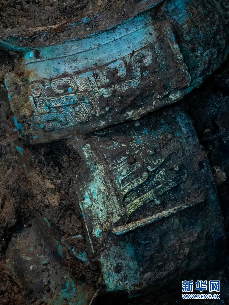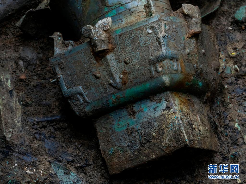 这是在四川省广汉市拍摄的三星堆遗址3号“祭祀坑”中新发现的青铜器局部(3月16日摄)。新华社记者沈伯韩摄