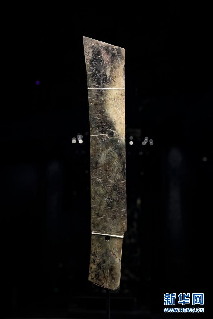 这是在位于四川省广汉市的三星堆博物馆拍摄的1986年出土于三星堆2号“祭祀坑”的祭山图玉璋(3月17日摄)。该玉璋两面阴刻相同的图案,图案分上下两组,正反相对呈对称布局,每组纹饰包含山陵、牙璋、云雷纹和两排做祭拜状的人像。新华社记者沈伯韩摄