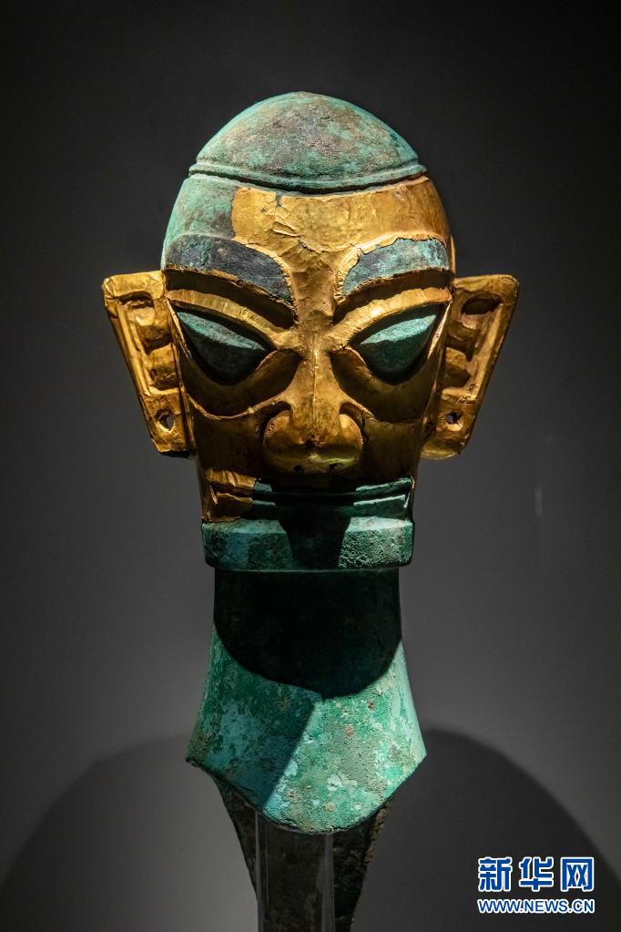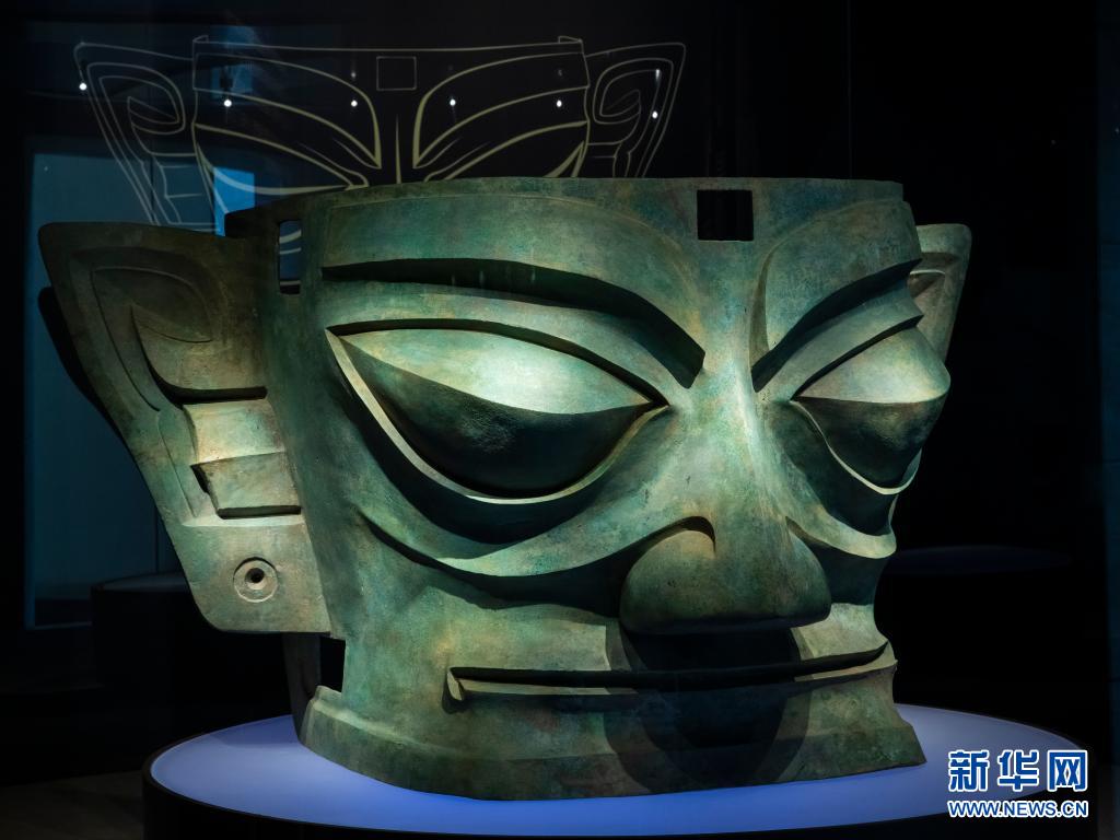 这是在位于四川省广汉市的三星堆博物馆拍摄的1986年出土于三星堆2号“祭祀坑”的戴金面罩青铜人头像(3月5日摄)。新华社记者沈伯韩摄