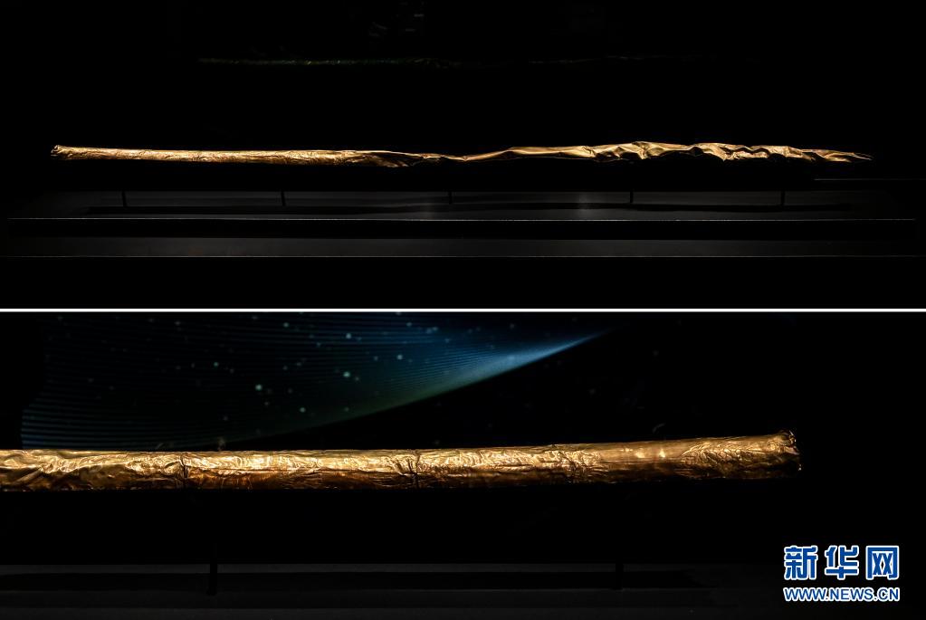拼版照片——上图是在位于四川省广汉市的三星堆博物馆拍摄的1986年出土于三星堆1号“祭祀坑”的金杖;下图是金杖的局部(3月17日摄)。金杖系用金条捶打成金皮后,再包卷在木杖上,出土时木芯已炭化,仅存金皮,金皮内可见炭化的木渣。新华社记者沈伯韩摄