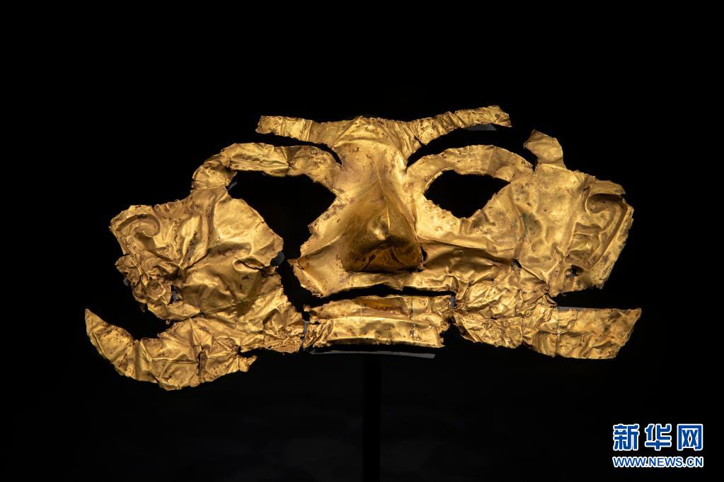 这是在位于四川省广汉市的三星堆博物馆拍摄的1986年出土于三星堆1号“祭祀坑”的金面罩(3月17日摄)。该金面罩系用金皮锤拓而成,其形制与金面铜人头像上的金面罩形同。新华社记者沈伯韩摄