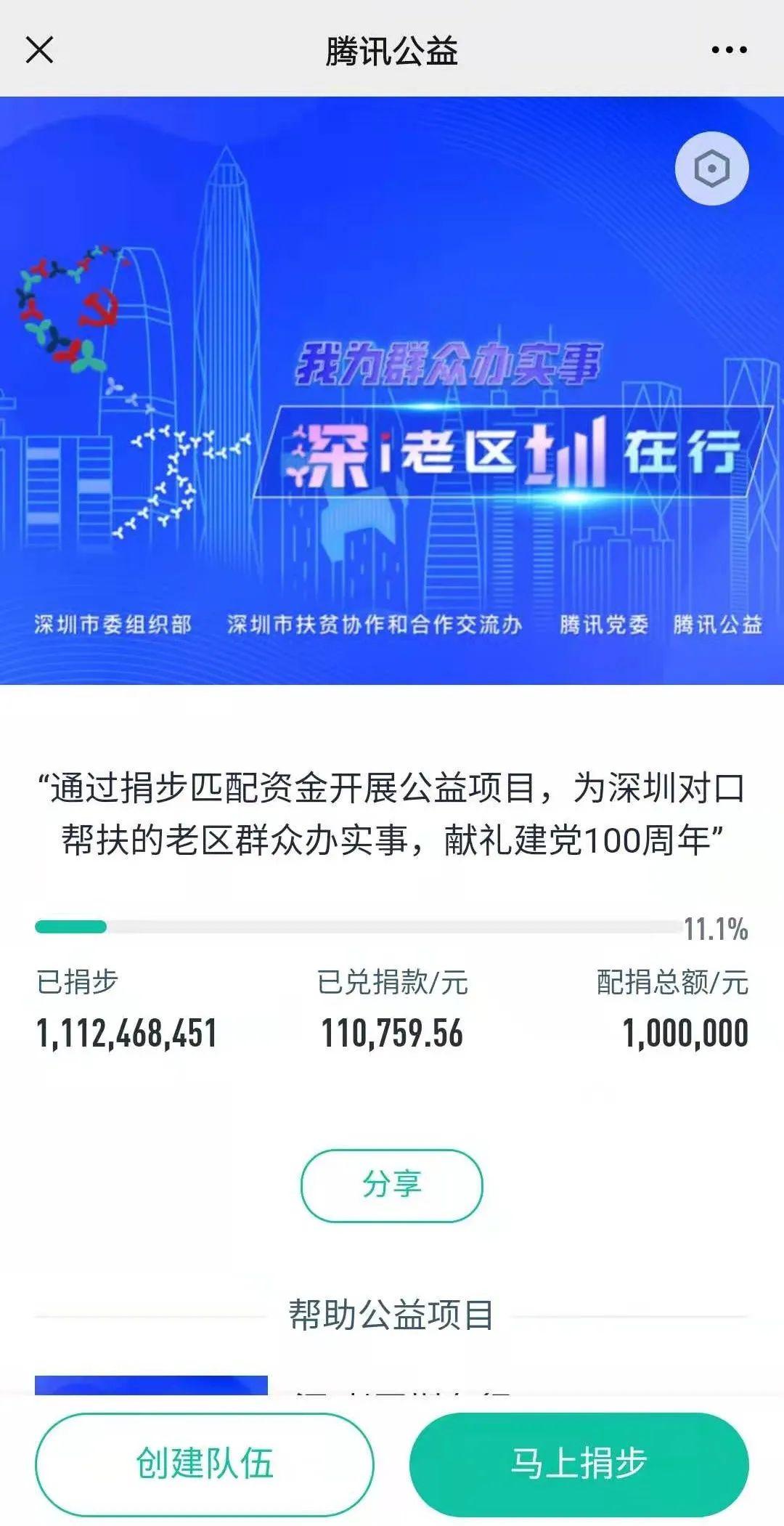 为深入推进党史学习教育,为群众办实事、办好事,深圳市委组织部、市扶贫办、腾讯公司联合开展“我为群众办实事 深i老区圳在行”活动,倡导广大党员群众微信捐步、支持公益。以个人或者组队的方式都可以参与到其中,积累的步数可兑换成慈善捐款,定点帮扶老区群众。