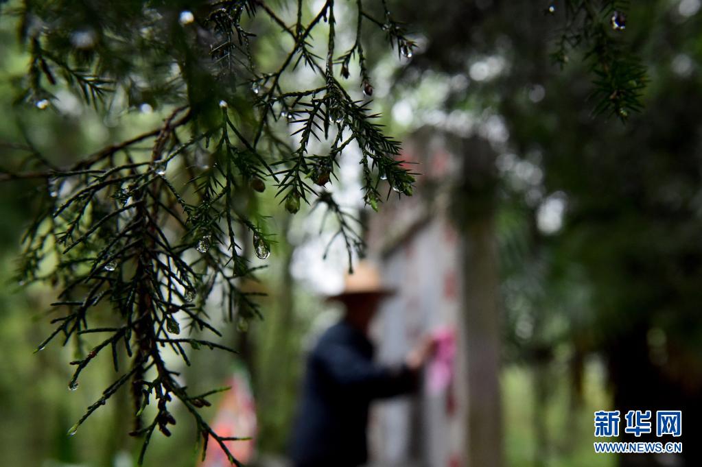4月1日,叶观山冒着小雨擦拭水龙烈士墓墓碑。