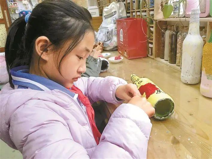 选取自己需要的纸浆颜色,用镊子和牙签一点点地将纸浆粘着在打了底稿的瓶子或者木板上……这是龙城小学的纸浆工艺课。