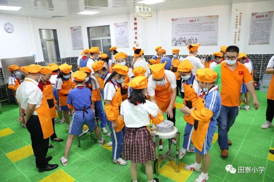 豆腐坊中,田寮小学的同学们听老师讲解豆腐制作流程后,兴致勃勃地“亲身上阵”。有的人舀豆子,有的推磨子,有的把磨出的浆用勺子刮到专用桶里……大家分工明确,团结合作。