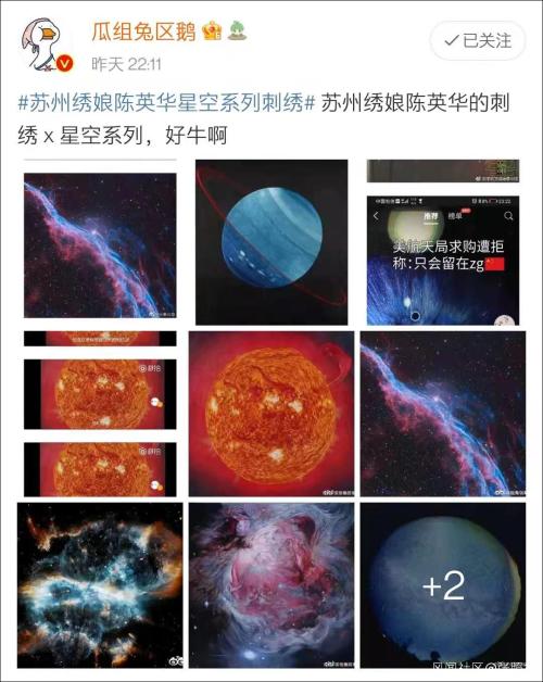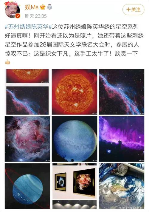 近日,苏绣艺术家陈英华的“天文奇观”的刺绣作品,震惊了一众网友。
