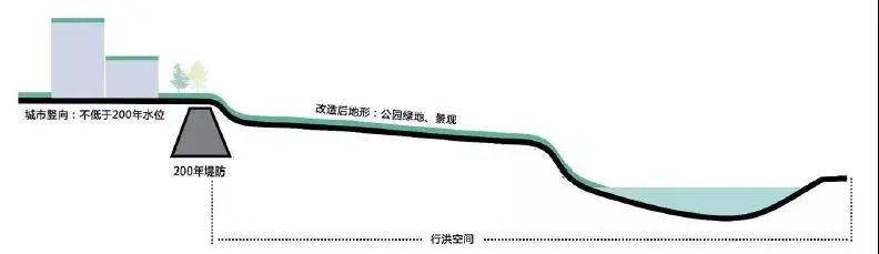 “傍水街区”的理念围绕城市与水的关系,针对外部主干水网设计了三种方式。第一种是场地抬高的安全模式,用堤坝拦截;第二种是两栖模式,洪峰最高的时候,洪水允许漫堤,在汛期可以作为可淹没场地,非汛期也有丰富的城市功能;第三种是欢乐海岸模式,将场地用堤坝围起来,内部水位是可控的,汛期使用闸口控水,保证内部在安全水平的同时还有水景观。
