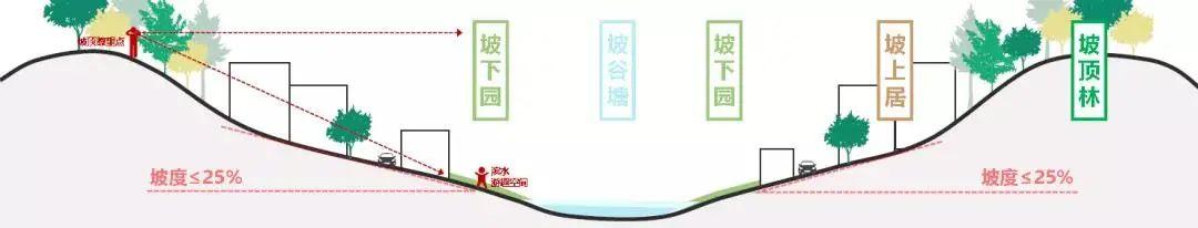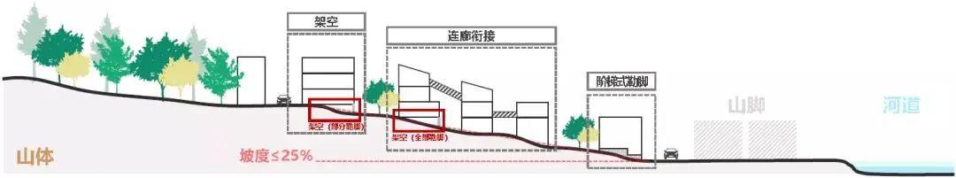 “随山街区”的布局方式主要针对城市与山体之间的关系。第一种随山缓坡单元,充分利用现有地形进行建设;第二种随山台地街区,针对坡度大于25%的地区,保留地形高差,运用设计手段消化高差;第三种指状坡岭街区,围绕山谷地展开城市建设。