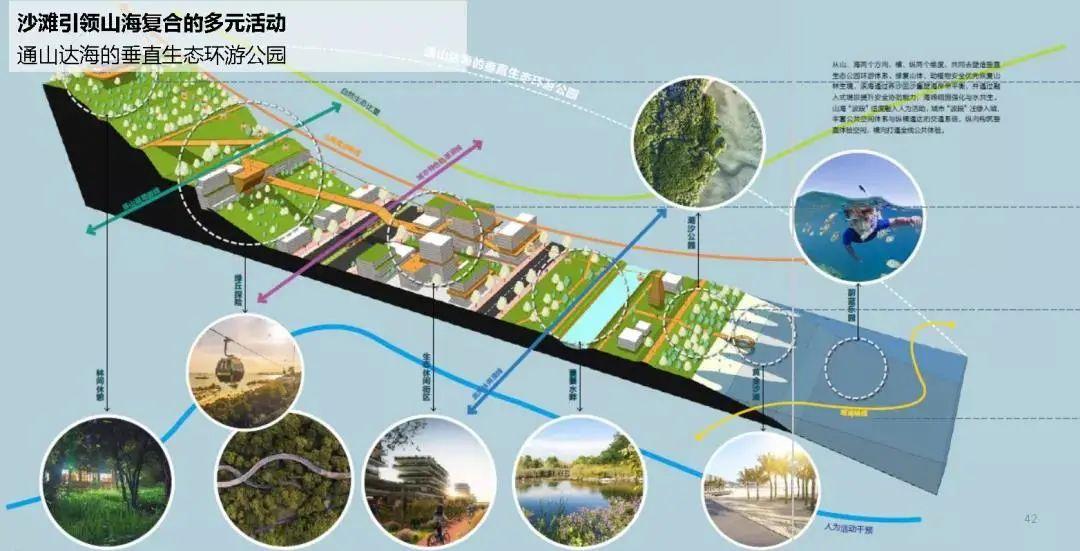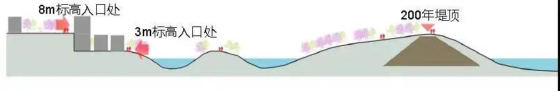 在滨海地区,提出“山海共栖”的方式,即分段分层的防潮海堤体系,不在沙滩、城市地区和山体之间做绝对、生硬的隔离,结合生态化处理、自然化处理的防潮带安排相应的公共空间和活动空间,实现“设堤不现、堤园结合”的景观化处理。在保障防潮安全的前提下,形成“通山达海”的垂直生态环游公园。