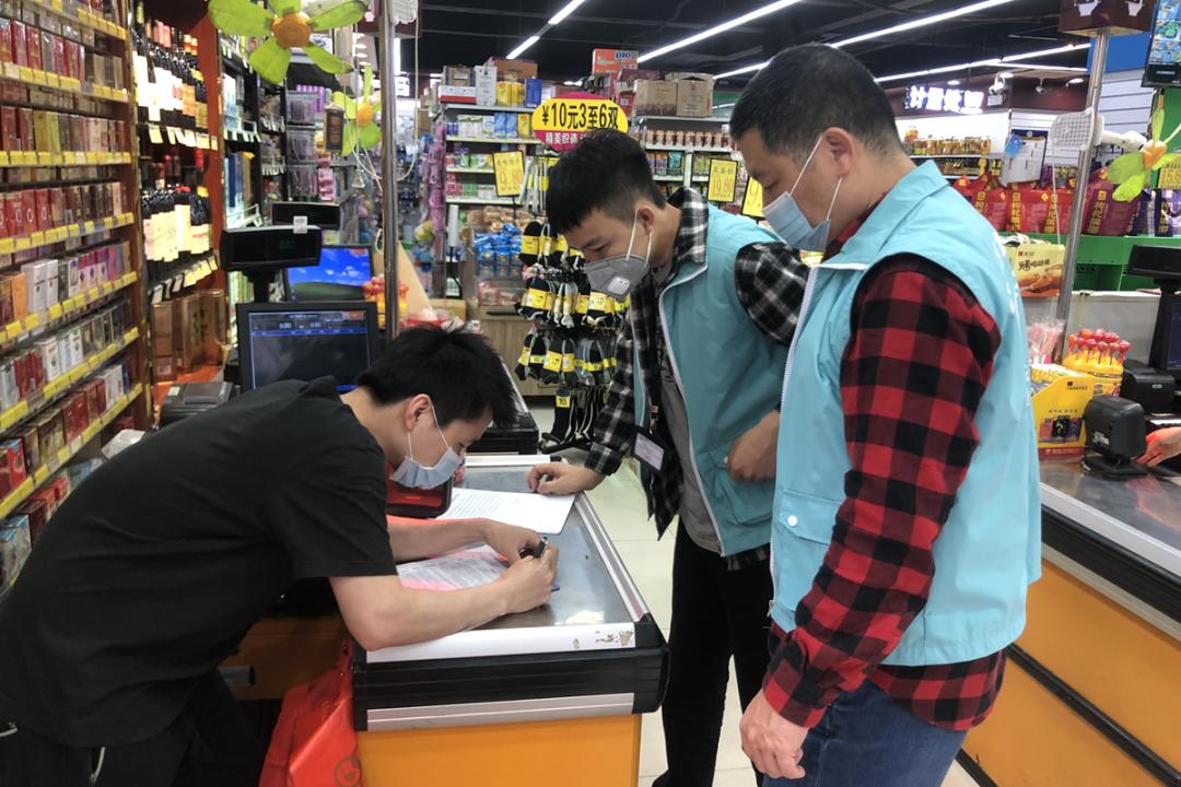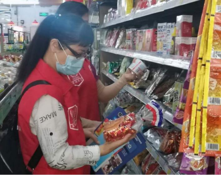 疫情防控期间,食品安全督导员对全区食品生产经营主体进行巡查↓