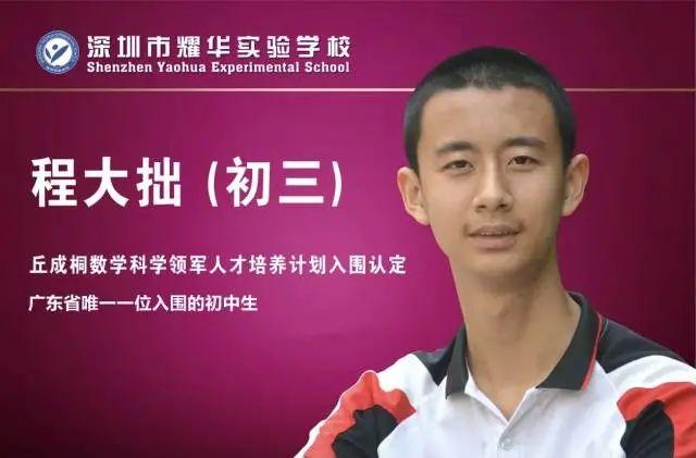 就读于深圳市福田区耀华实验学校的程大拙于近日轰动全国。3月底,清华大学“丘成桐数学科学领军人才培养计划”(以下简称“新领军计划”)入选结果出炉,此次面向全球招收的68名学生中,只有两位初中生入选,其中一位就是来自深圳市福田区耀华实验中学的初三学生,14岁天才少年程大拙。