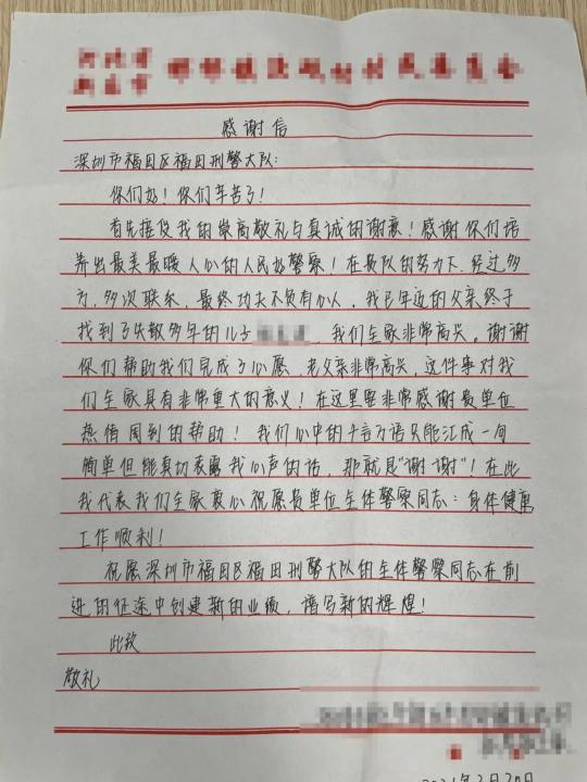 张某坡的家人哽咽着向在场所有人深深鞠躬,并向福田分局刑警大队三中队送上了“人民卫士,一心为民”的锦旗和感谢信,感谢福田分局刑警大队为这次久别的重逢所做的不懈努力。这场时隔18年的重聚让现场所有人为之动容。