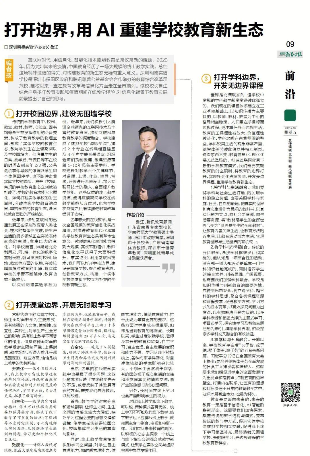 互联网时代,用信息化、智能化技术赋能教育是常议常新的话题。2020年,因为突如其来的疫情,中国教育经历了一场大规模的线上教学实践。总结这场特殊试验的得失,对构建教育的新生态无疑有重大意义。深圳明德实验学校是深圳市福田区政府和腾讯慈善公益基金会合作举办的教育综合改革示范校,建校以来一直在教育改革与信息化方面走在全市前列。该校校长鲁江结合自身多年教育实践和疫情期间在线教学经验,对信息化背景下教育发展前景提出了自己的思考。