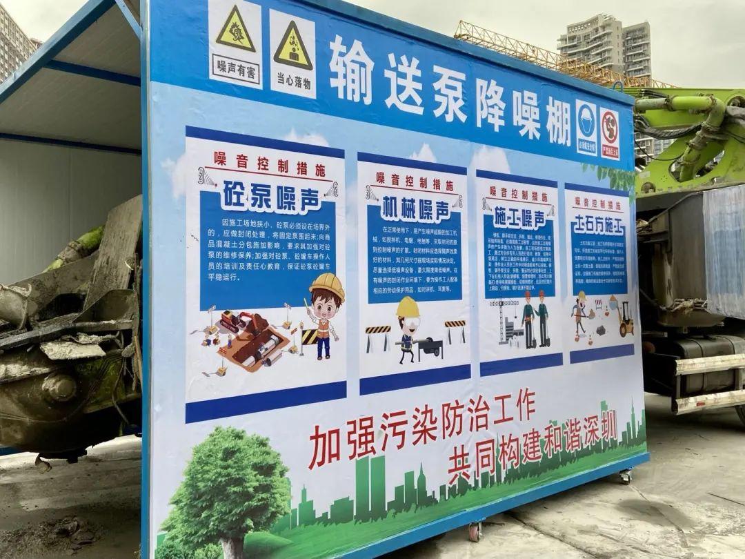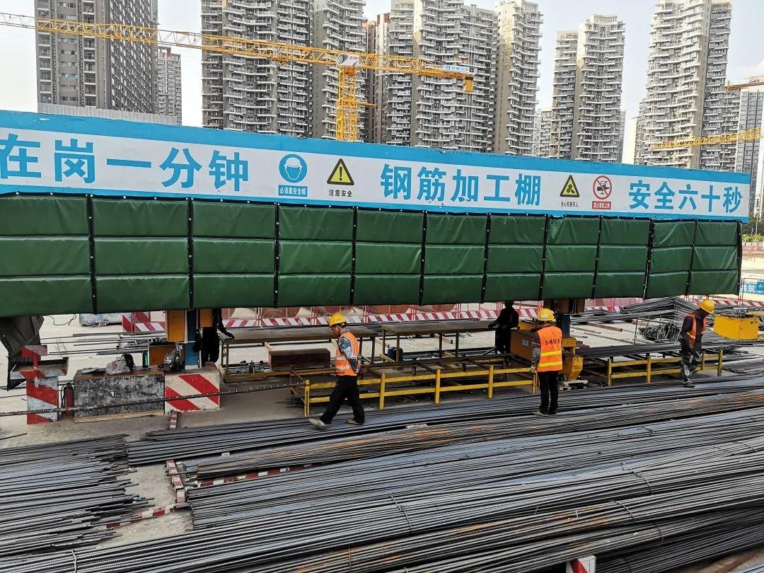 在浇筑混凝土时,在噪音敏感区附近设置了混凝土输送泵降噪棚、运输车辆隔声棚,钢筋加工车间还搭设了隔音屏,可大幅度降低噪声。