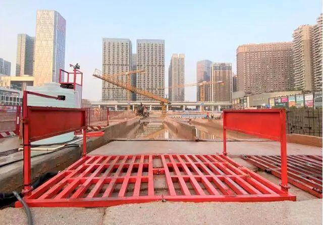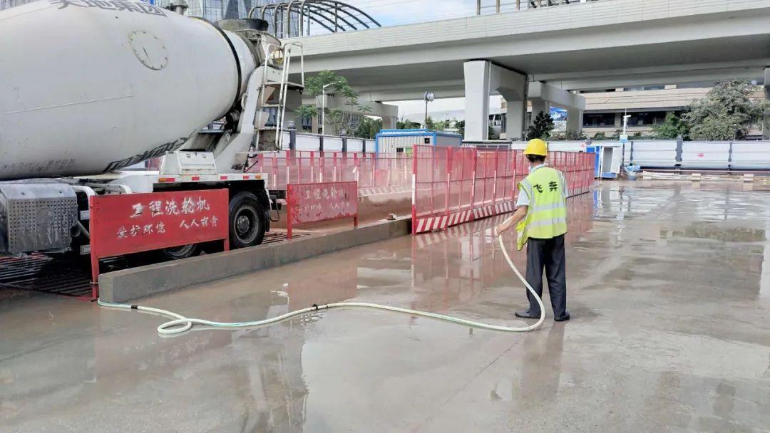 出入口100%安装冲洗设施,大门入口处设置有洗车台,对前后左右轮胎冲洗干净后方能驶入市政道路。车辆冲洗后的污水经沉淀池处理,回收利用于现场洒水抑尘并定期对沉淀池进行清掏。