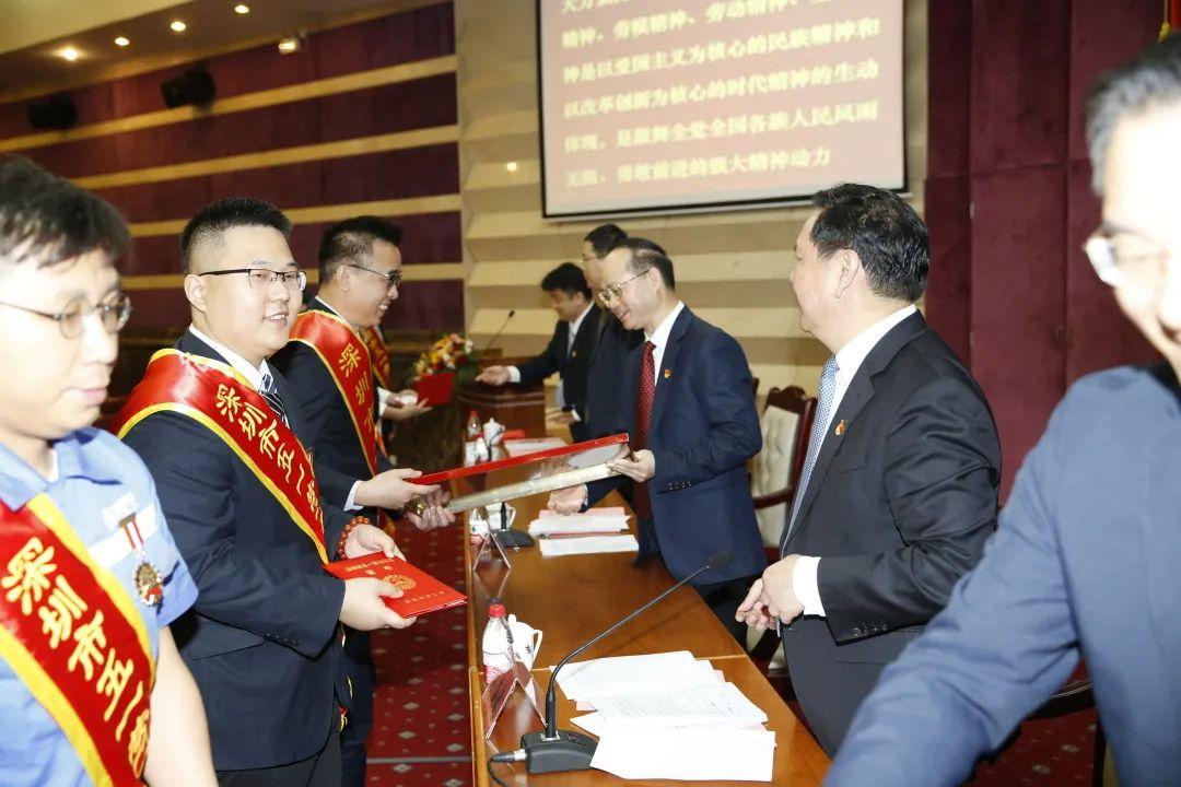 在庄严而热烈的气氛中,受表彰的先进个人和集体代表身披绶带接受表彰。
